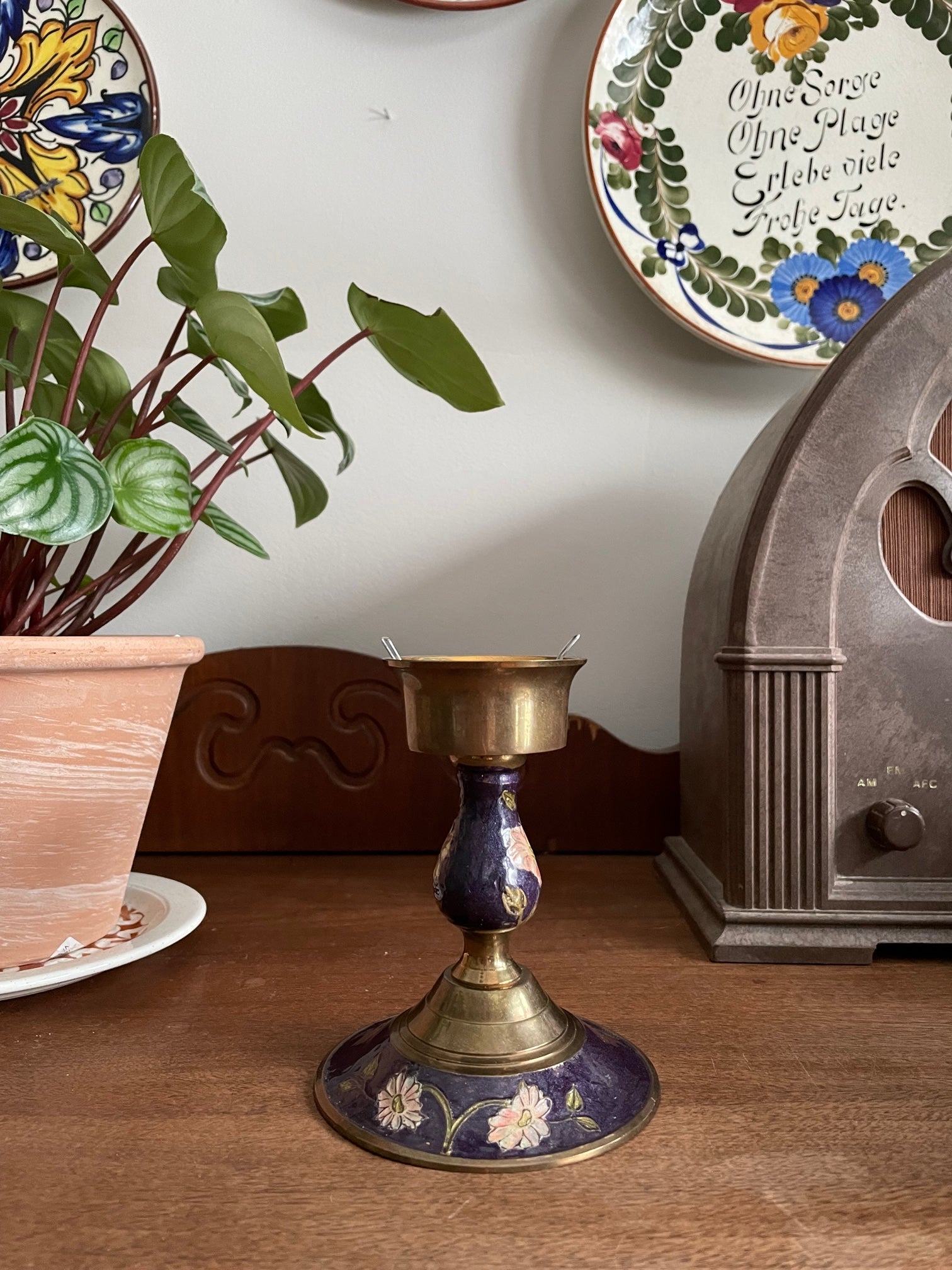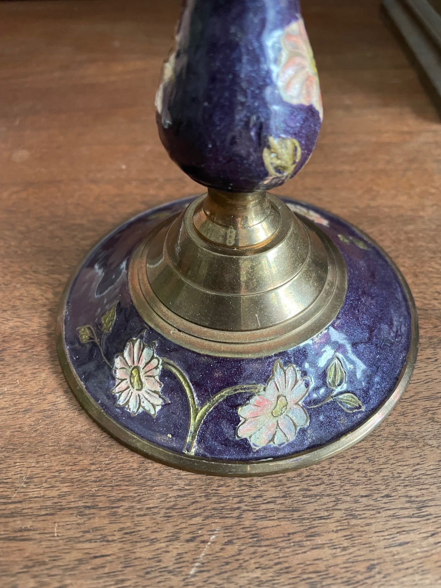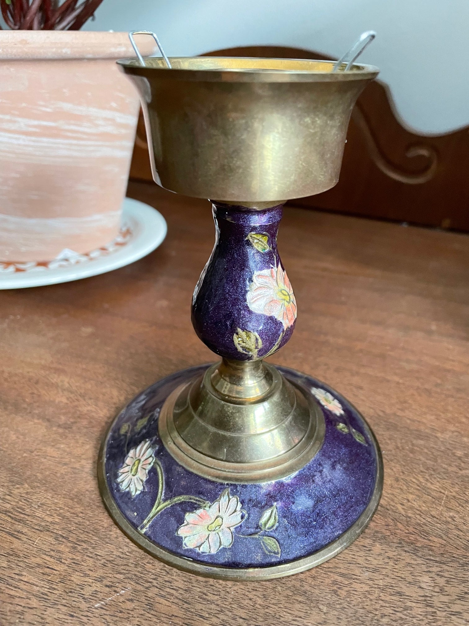 Solid brass vintage candle holder with hand painted etching. Made in India