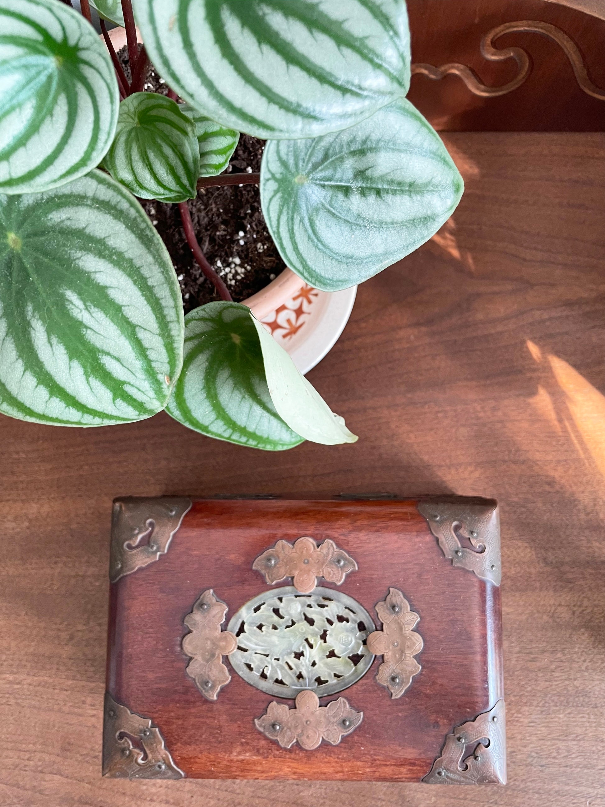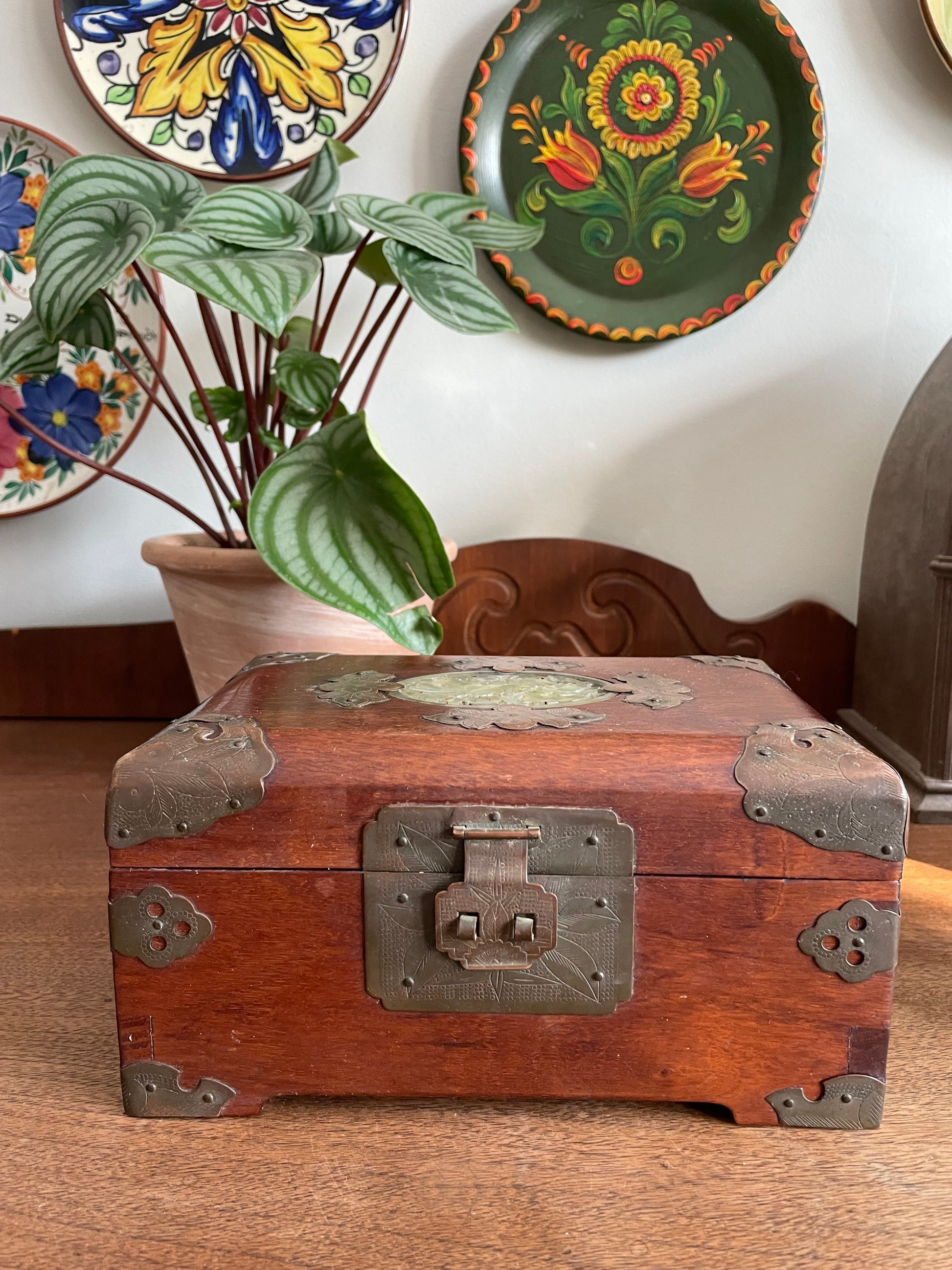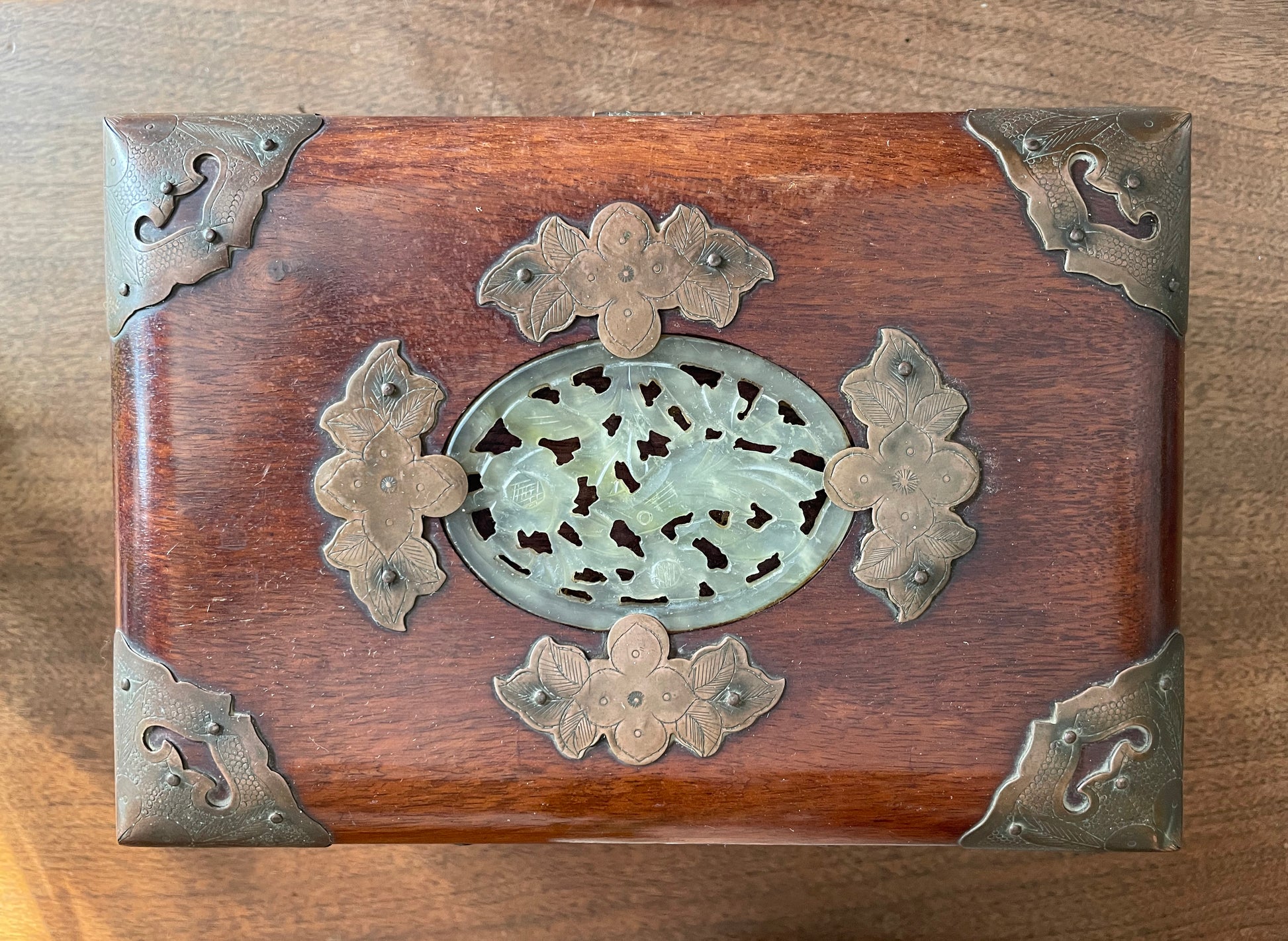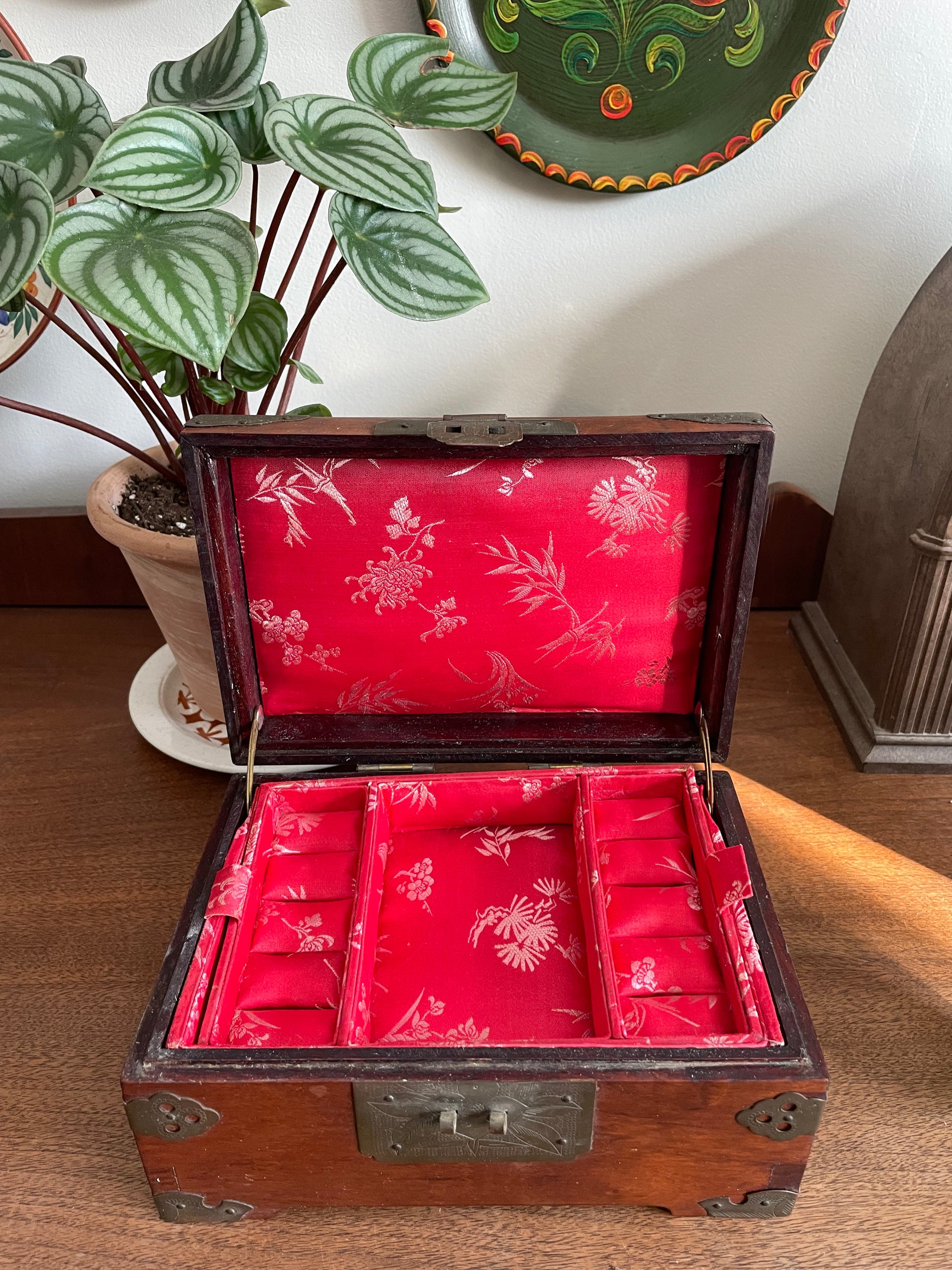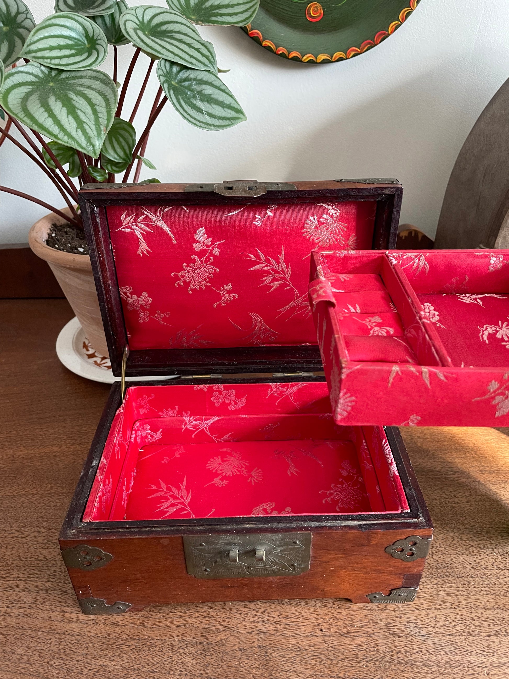 A vintage asian design jewelry box with 2 upholstered compartments.