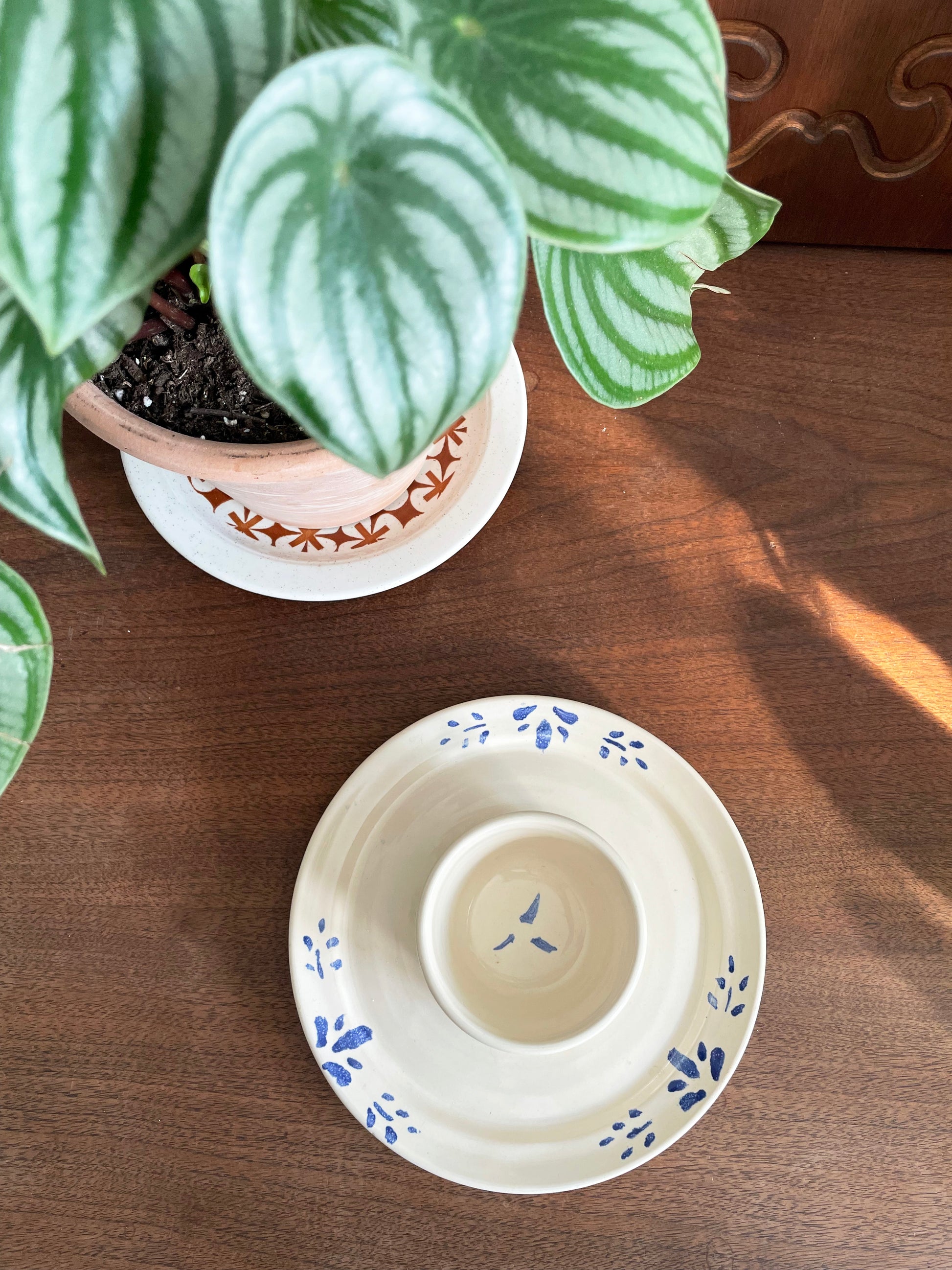Handmade glazed serving plate with a middle saucer.