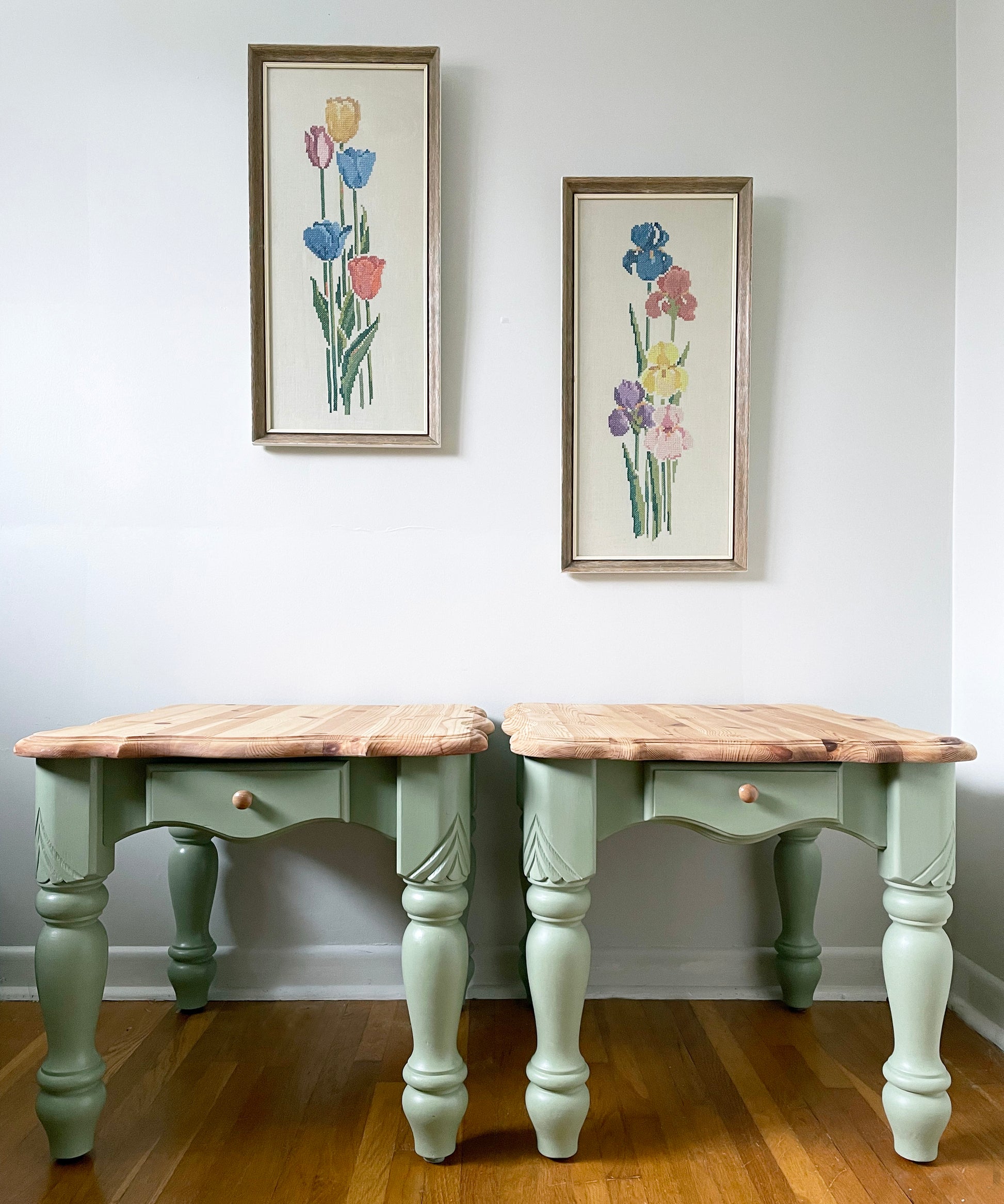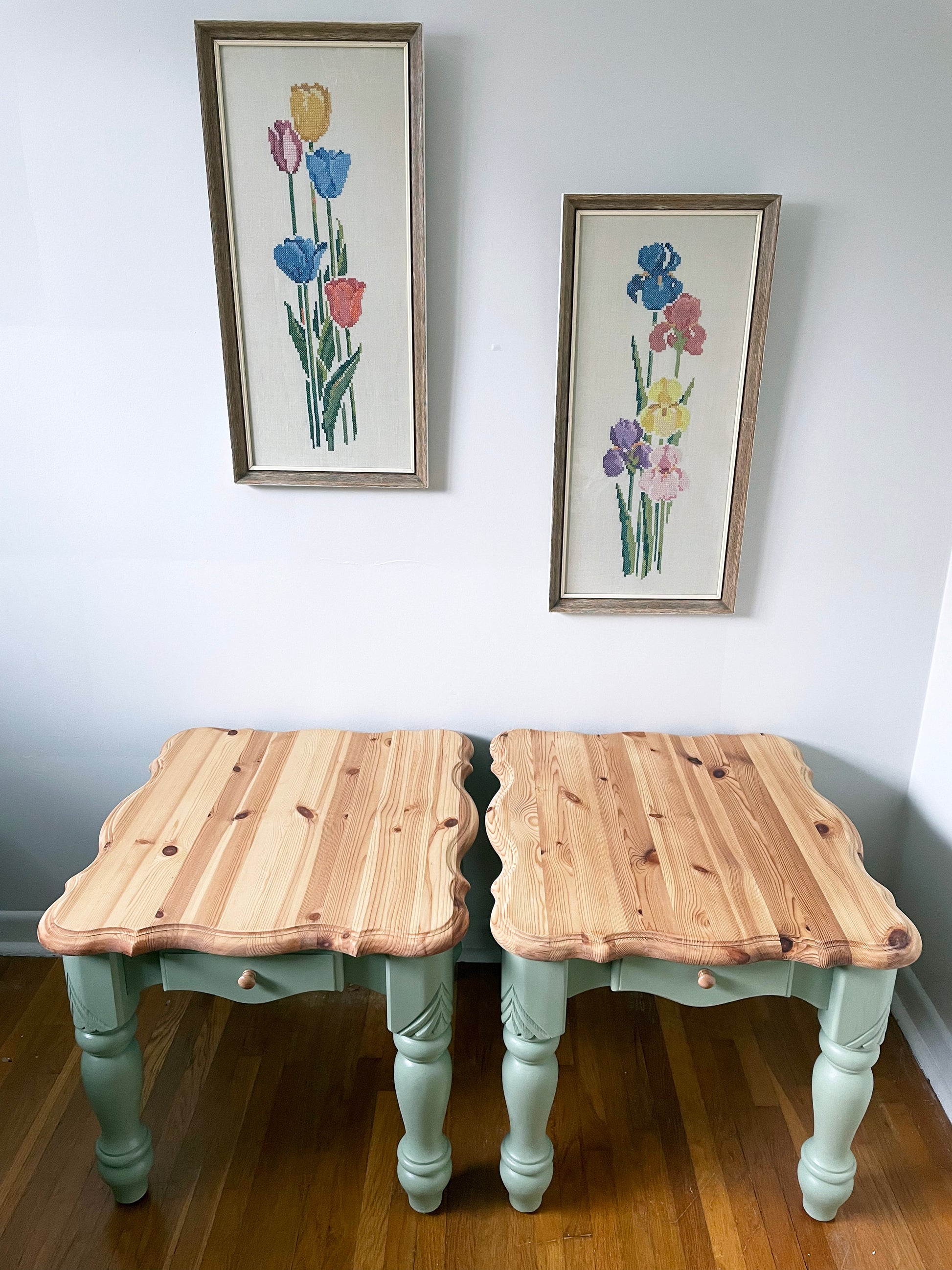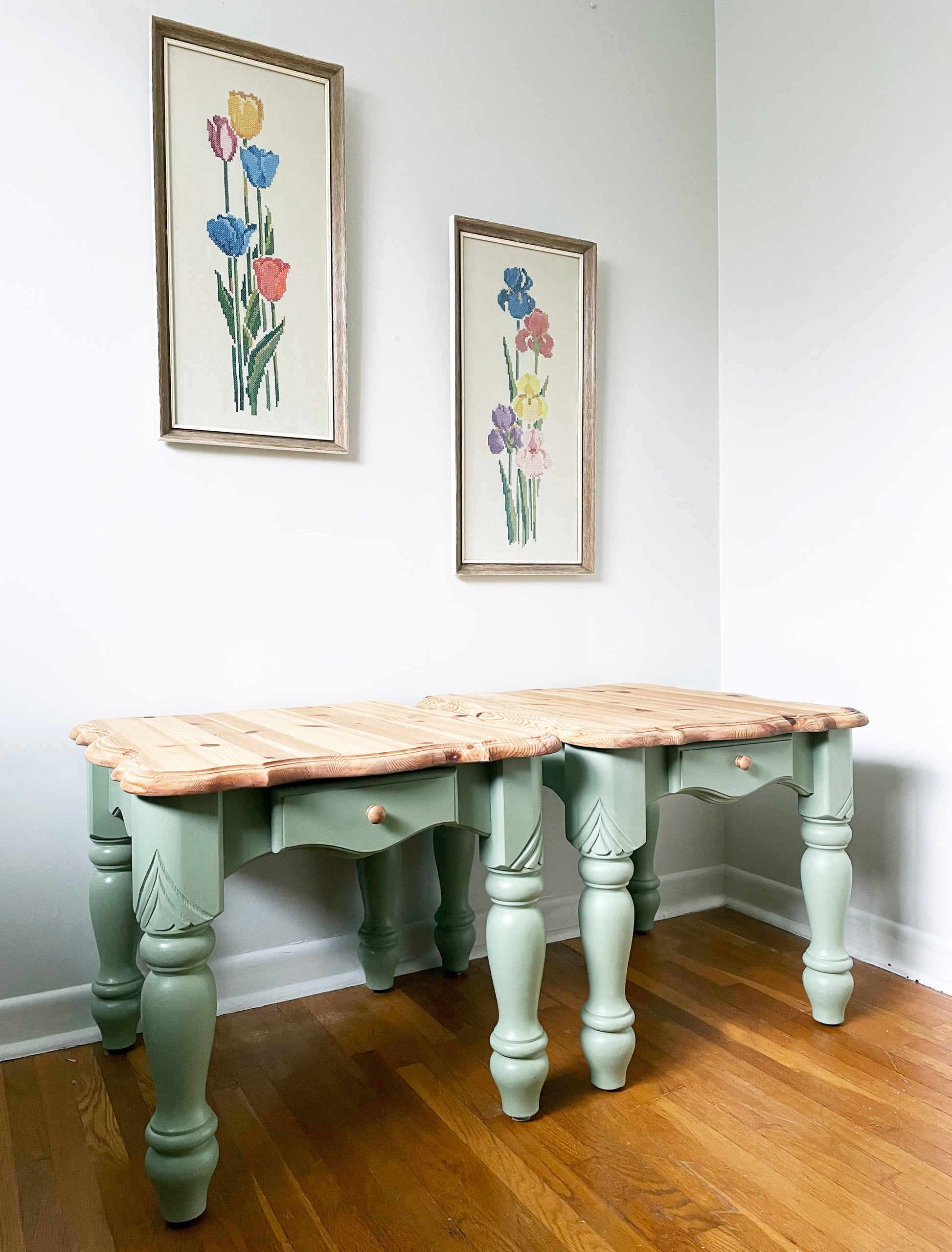 These twin tables had chipped yellowish paint in their previous lives. They've been cleaned, sanded & painted in a beautiful sage color. I kept their tops raw & coated them with Hemp oil.