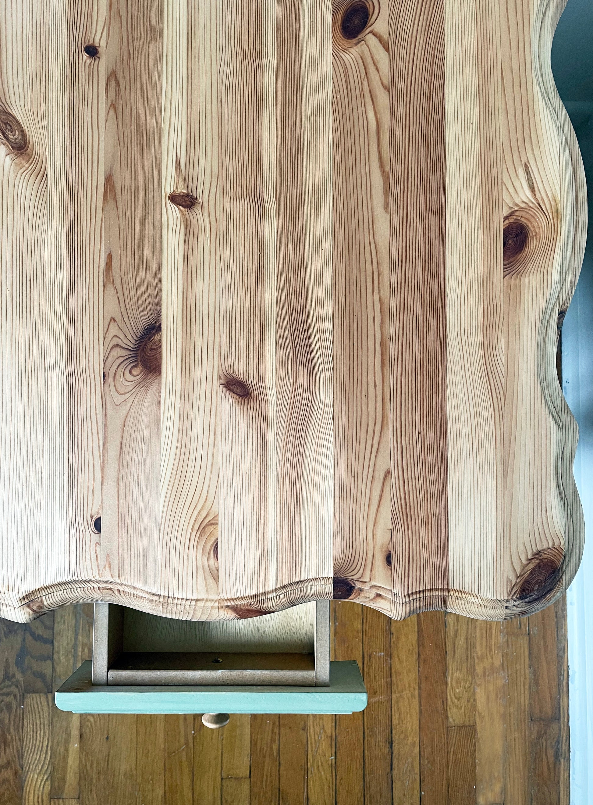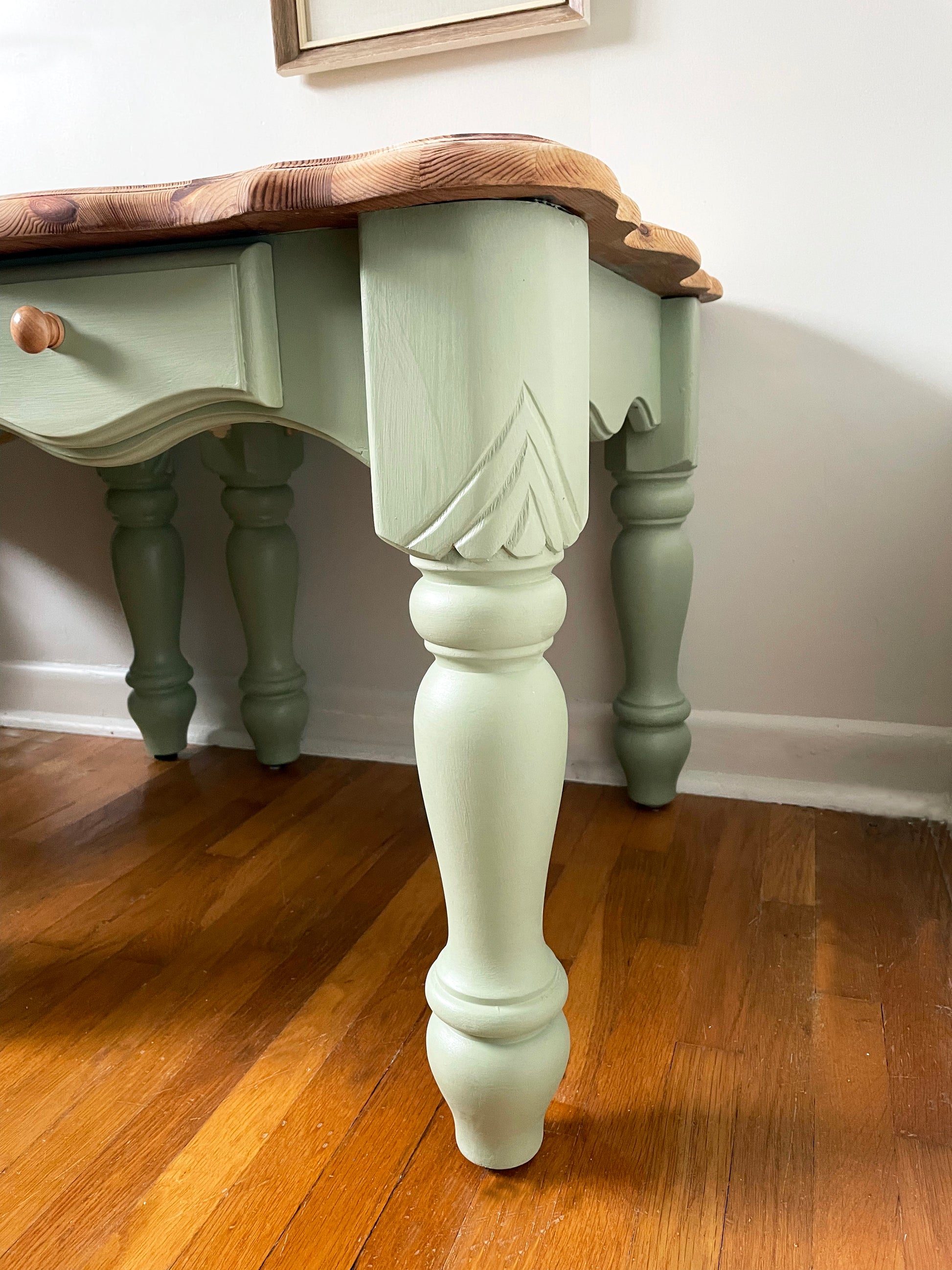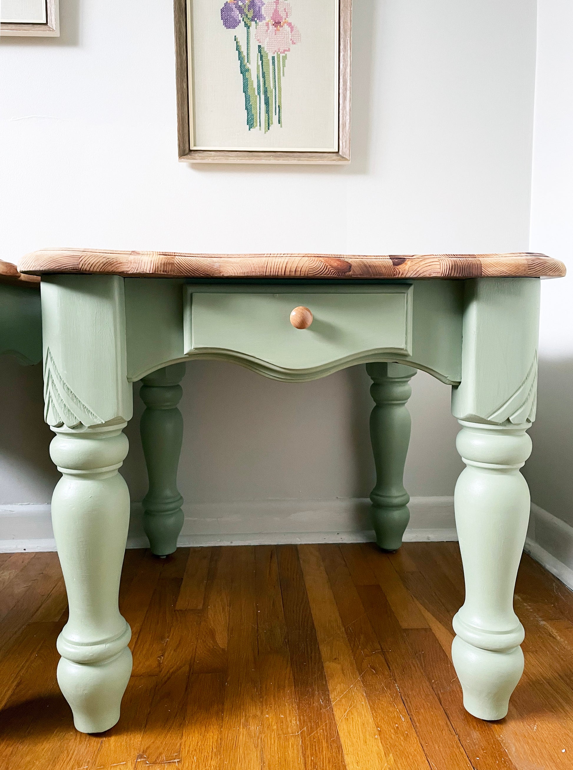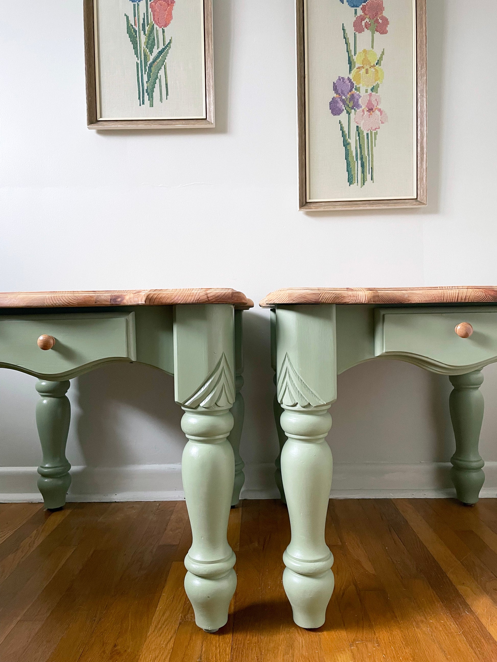 These twin tables had chipped yellowish paint in their previous lives. They've been cleaned, sanded & painted in a beautiful sage color. I kept their tops raw & coated them with Hemp oil.